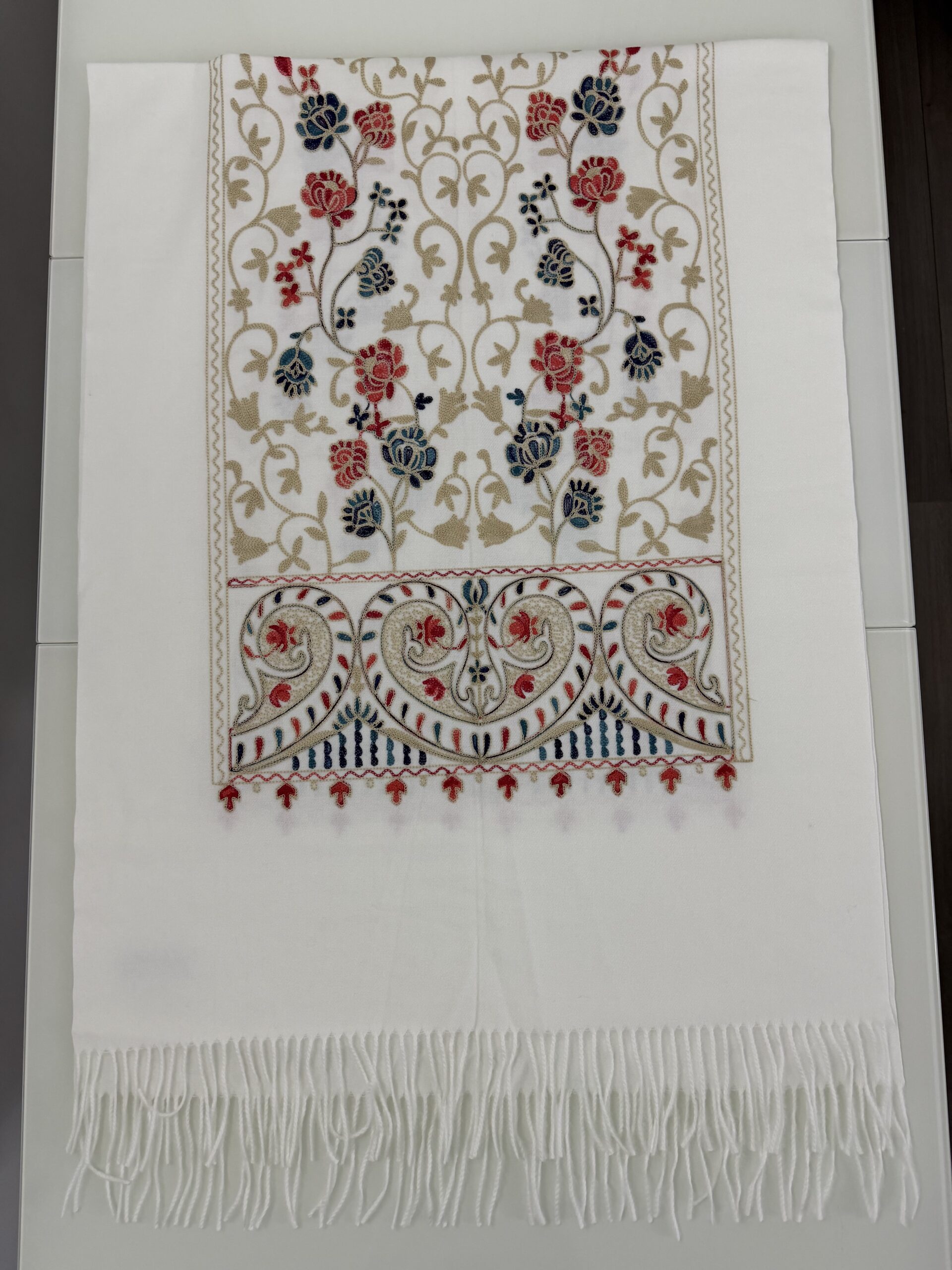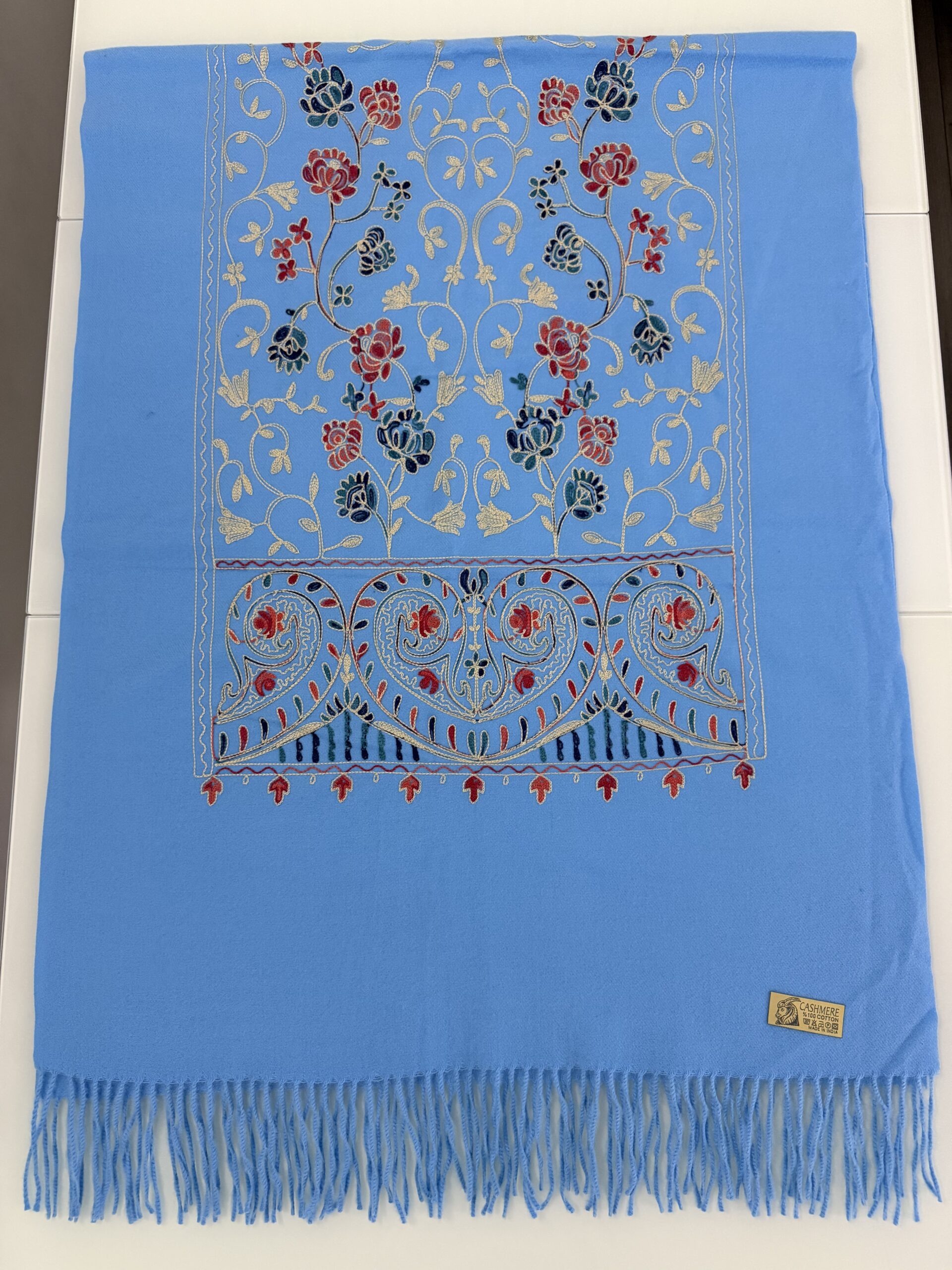 Ervaar ultieme zachtheid en tijdloze elegantie met onze dikke cashmere sjaal, verfijnd afgewerkt met subtiele geborduurde details. De rijke stof voelt heerlijk zacht aan en biedt optimale warmte tijdens koude dagen, terwijl het verfijnde borduurwerk zorgt voor een exclusieve en stijlvolle uitstraling.